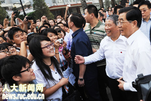 面对图书馆外翘首期待、热情迎候的人大师生,胡锦涛同志与他们一一握手,希望同学们继续努力,把自己培养成国家、社会所需要的杰出人才。