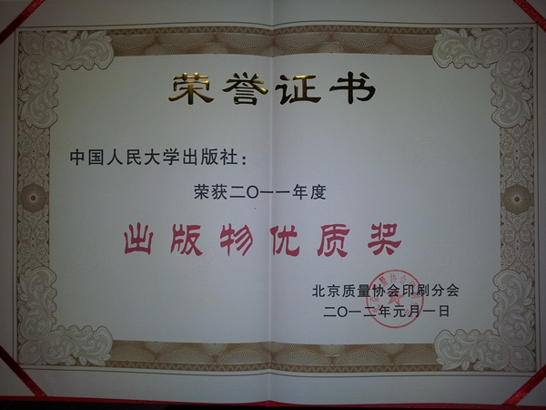 2012年3月21日,由北京质量协会印刷分会、北京市印刷工业产品质量监督检测站共同召集的“2012年质量工作会议”在京召开。会上,人大社荣获“2011年度出版物优质奖” ,196个图书品种被评为“2011年度北京出版物印制优质产品”。