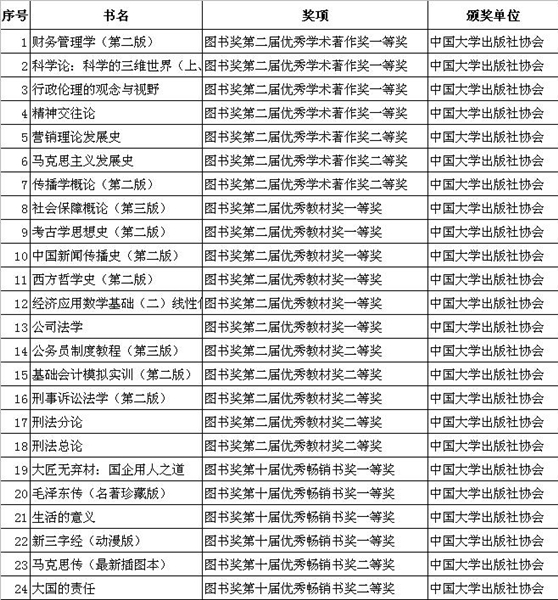 我社在中国大学出版社协会举办的优秀图书奖评奖中喜获丰收,其中《科学论:科学的三维世界(上、下卷)》、《精神交往论》等6部学术著作获得“优秀学术著作奖”,《西方哲学史(第二版)》、《中国新闻传播史(第二版)》等11种教材获得“优秀教材奖”,《毛泽东传(名著珍藏版)》、《新三字经(动漫版)》等6种图书获得“优秀畅销书奖”。