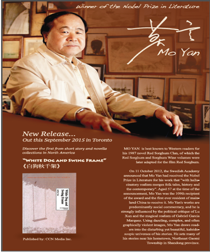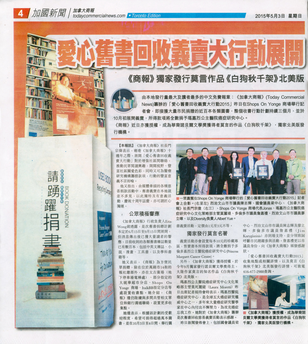 下图为加拿大商报对本次义卖活动及莫言的《白狗秋千架》英文版发行活动的报道。